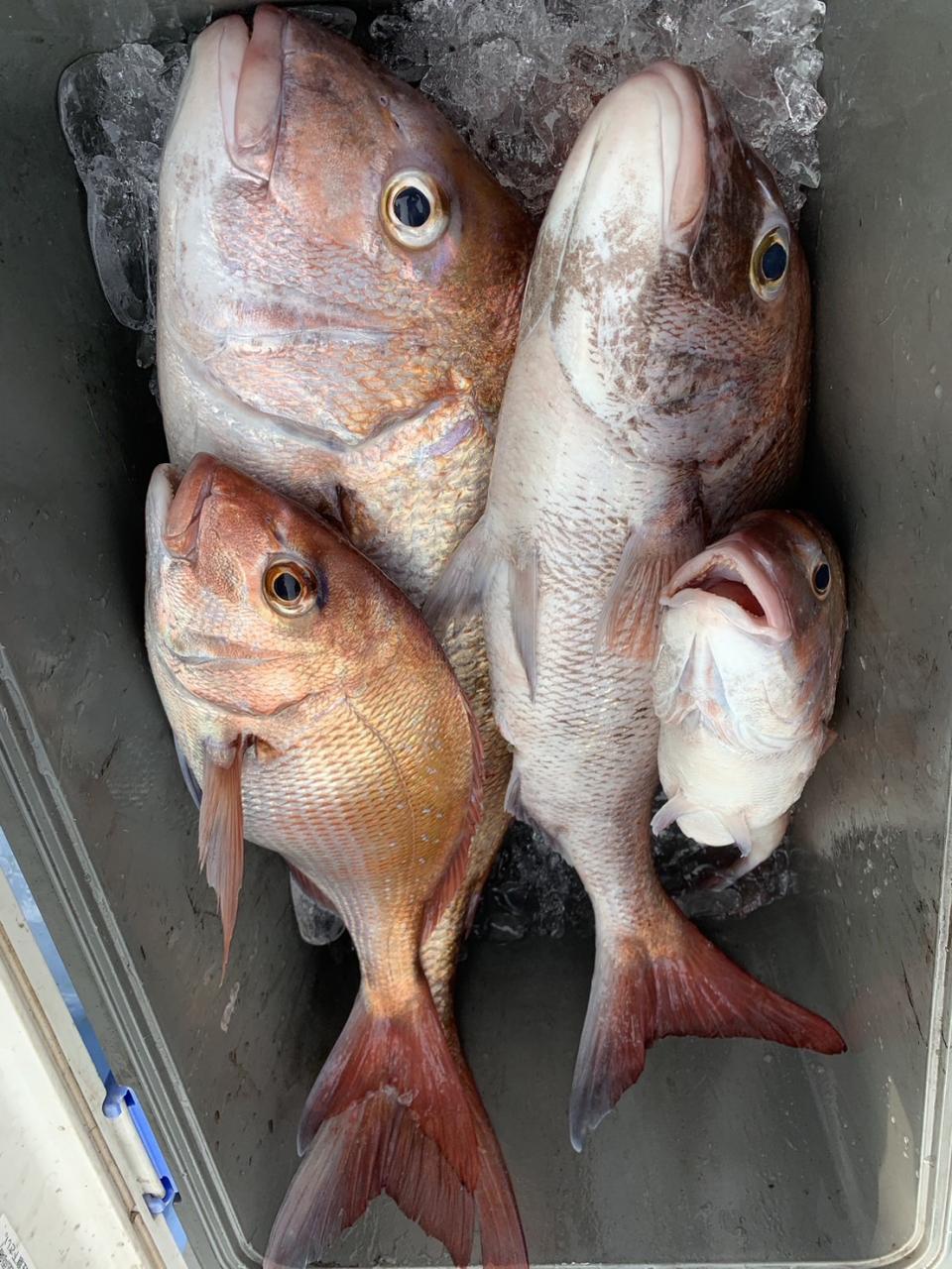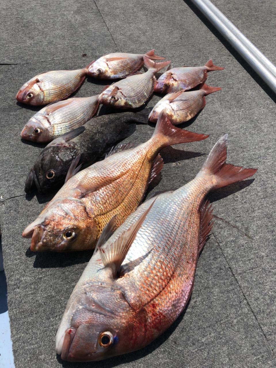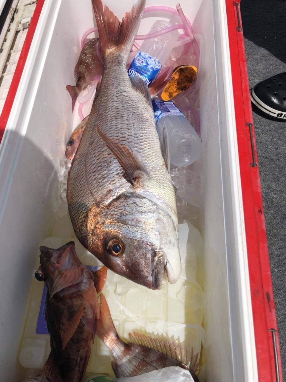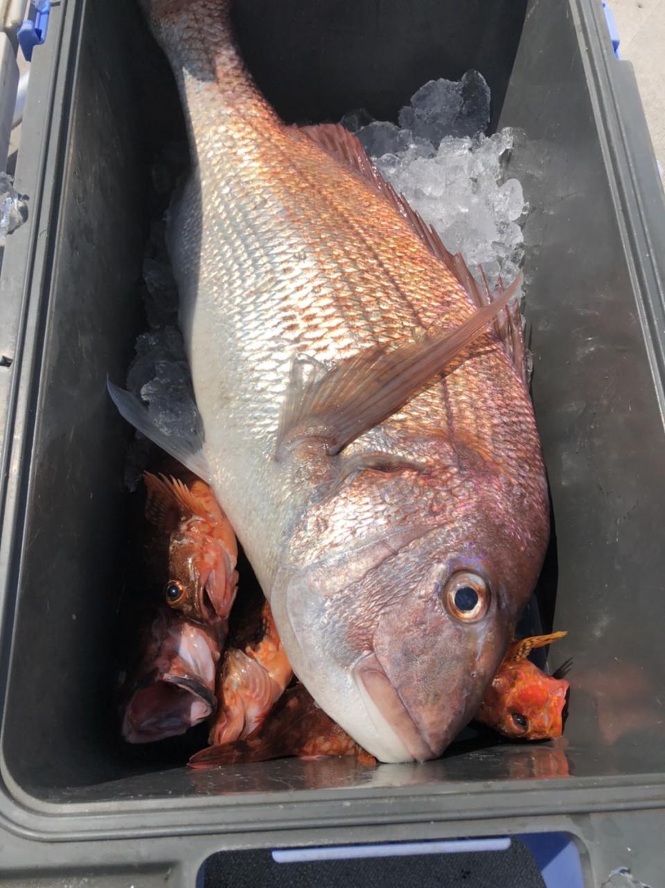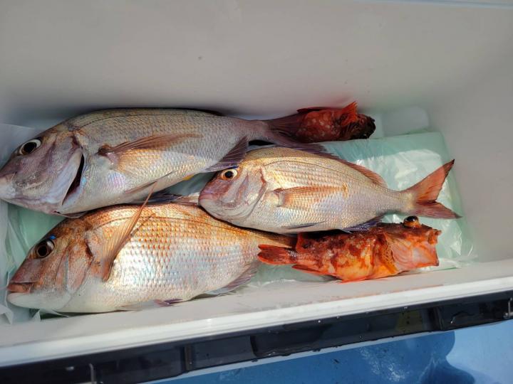 今日は風と波もあって釣りにくい状況ではありましたがポツリポツリとアタリもあり、本命マダイをはじめ他ハナダイ、カサゴ、フグ、イナダ、ヒラメなどのゲストも上がりました。