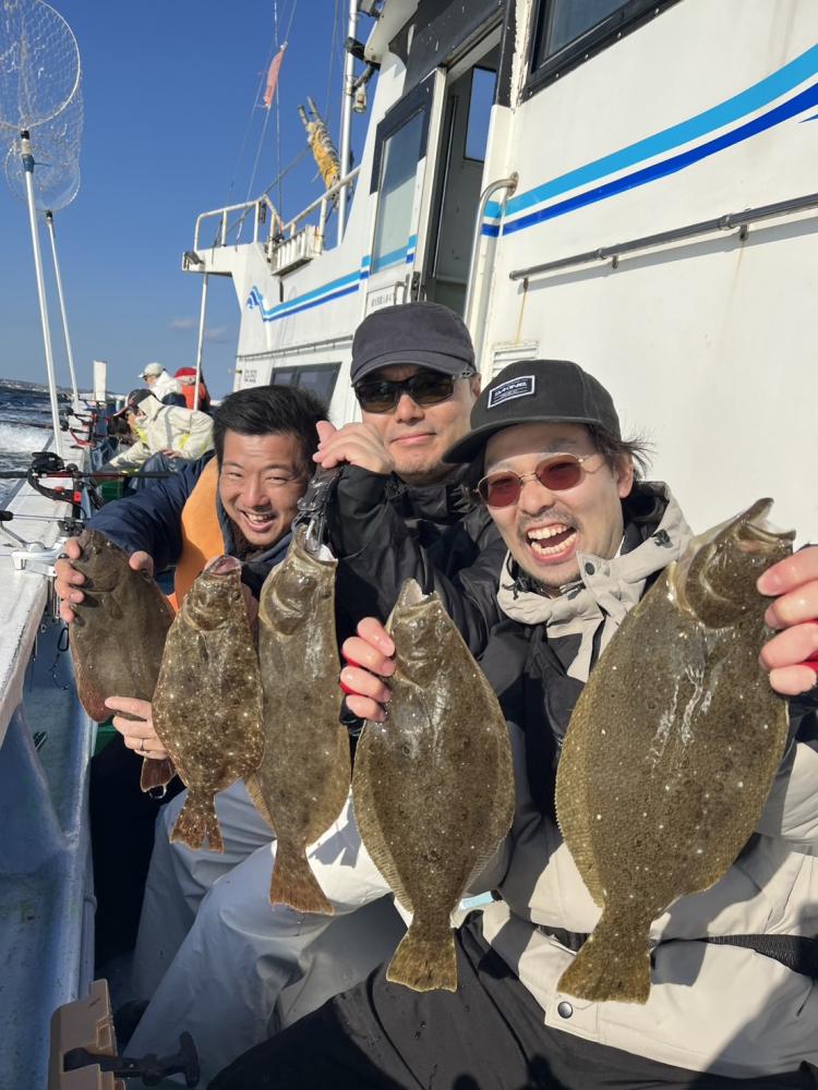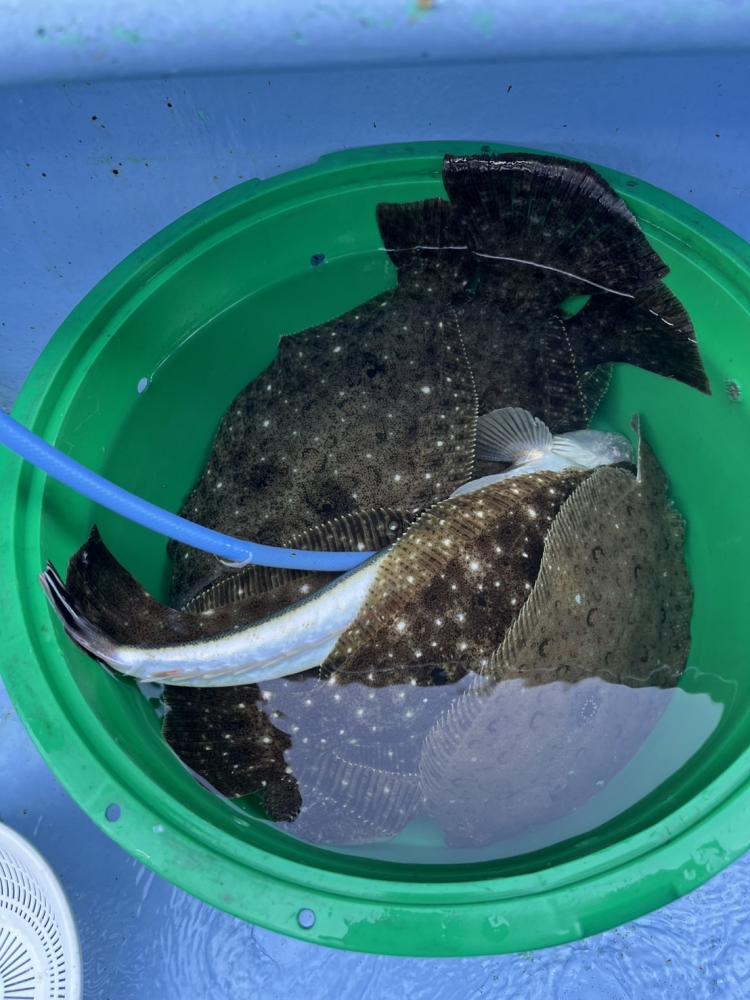 今日はウネリ高く底取りしづらいもののヒラメのアタリはポツリポツリとあり無事ヒラメ全員ゲット!!